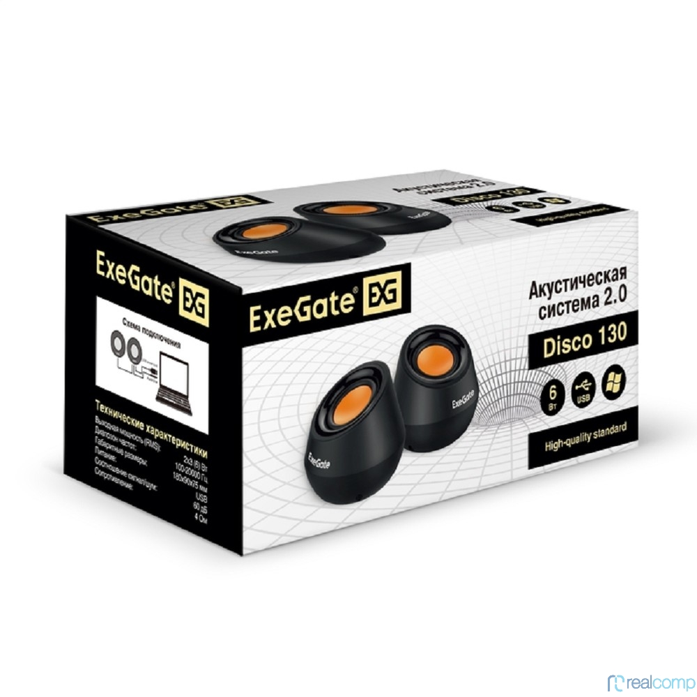 Exegate EX287060RUS Акустическая система 2.0 ExeGate Disco 130 (питание USB, 2х3Вт (6 Вт RMS), 100-20000Гц, черный/оранжевый)