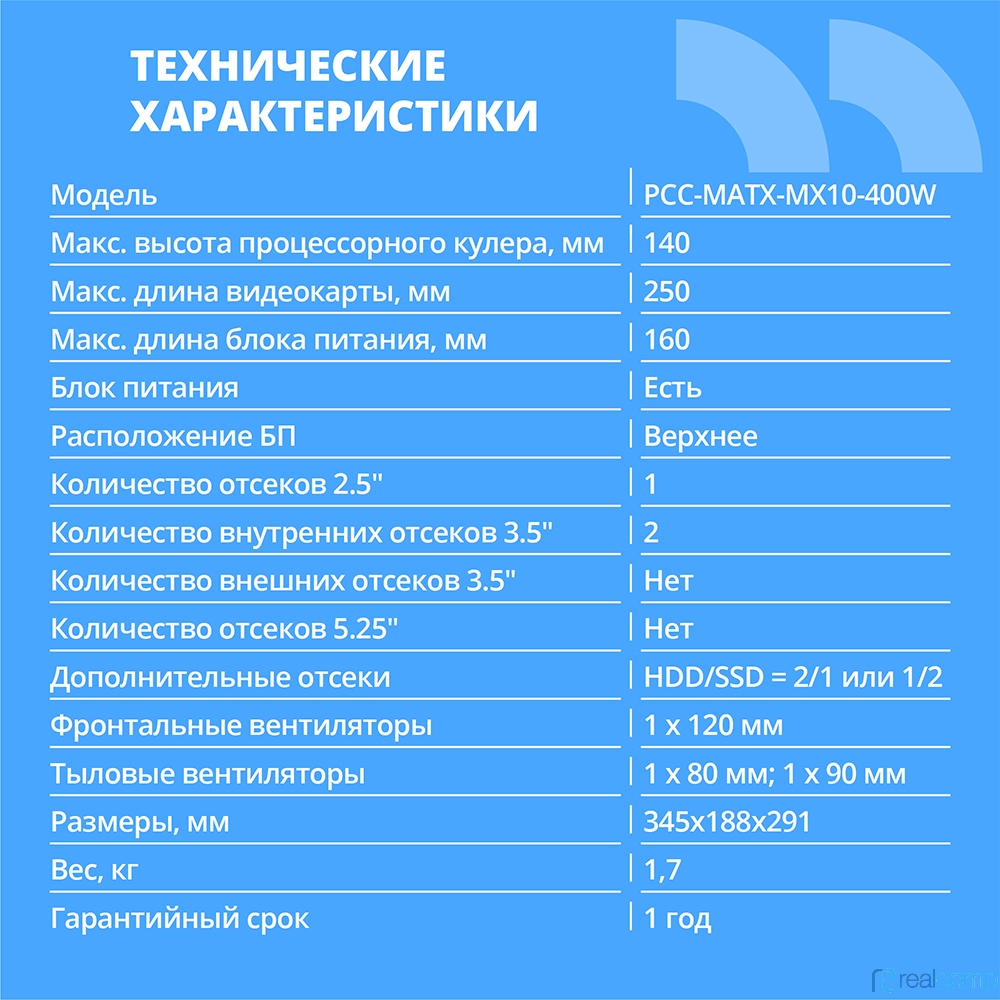 CBR Корпус mATX Minitower MX10, c БП PSU-ATX400-12EC (400W/120mm), 2*USB 2.0, HD Audio+Mic, Black [PCC-MATX-MX10-400W]