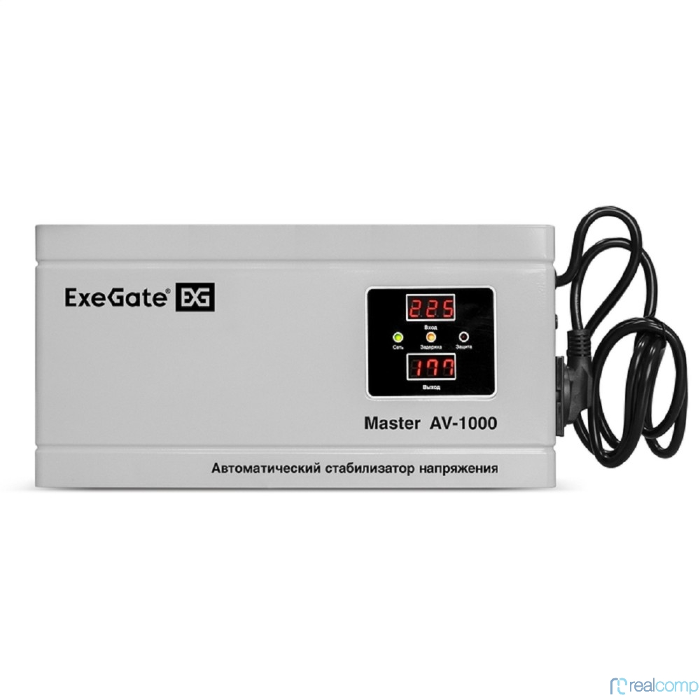 Exegate EX291737RUS Стабилизатор напряжения ExeGate Master AV-1000 (1000ВА, 140-260В, цифр. индикация вход/вых. напряжения, 220В±8%, КПД 98%, 5 уровней защиты, задержка, метал.корпус, евророзетка, RTL