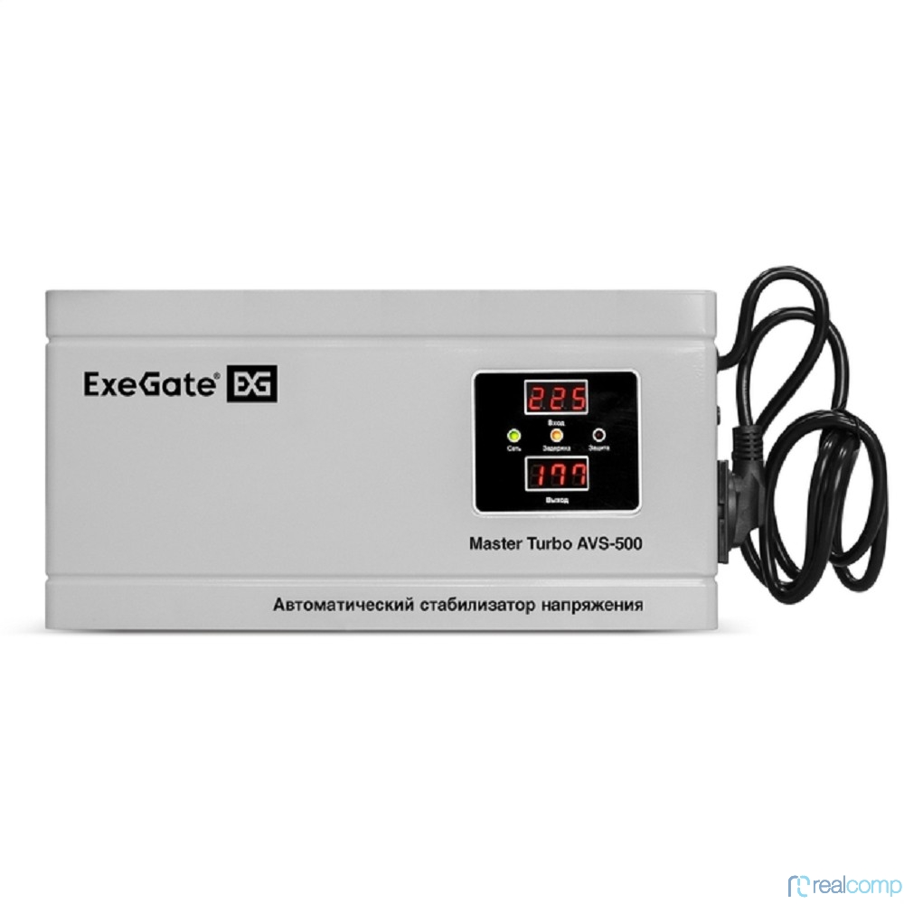 Exegate EX291744RUS Стабилизатор напряжения ExeGate Master Turbo AVS-500 (500ВА, 100-265В, цифр. индикация вход/вых. напряжения, 220В±8%, КПД 98%, 5 уровней защиты, задержка, усиленный метал.корпус, е