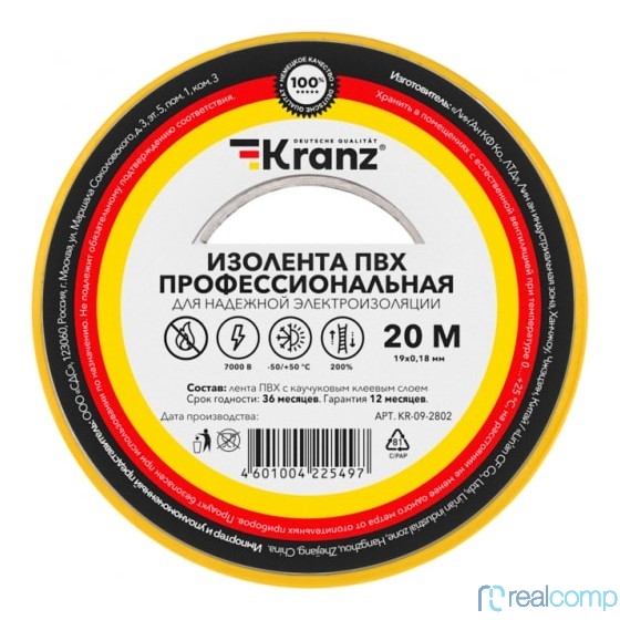 Rexant KR-09-2802 Изолента ПВХ профессиональная, 0,18х19 мм, 20 м, желтая KRANZ