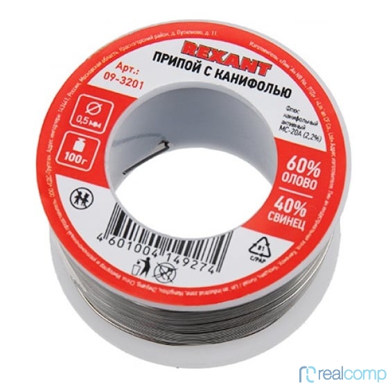 REXANT (09-3201) Припой с канифолью , 100 г, O0.5 мм, (олово 60%, свинец 40%), катушка, блистер