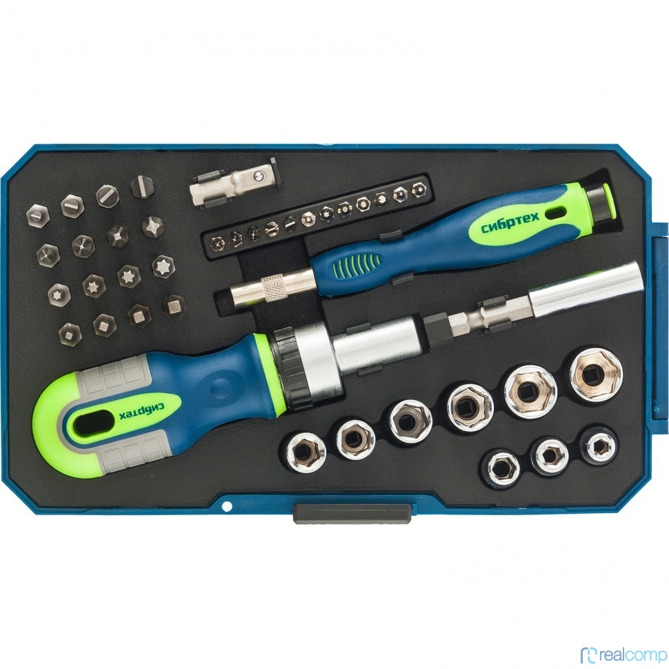 СИБРТЕХ Отвертки реверсивные с набором бит и торцевых головок, 41 шт., CrV [13338]