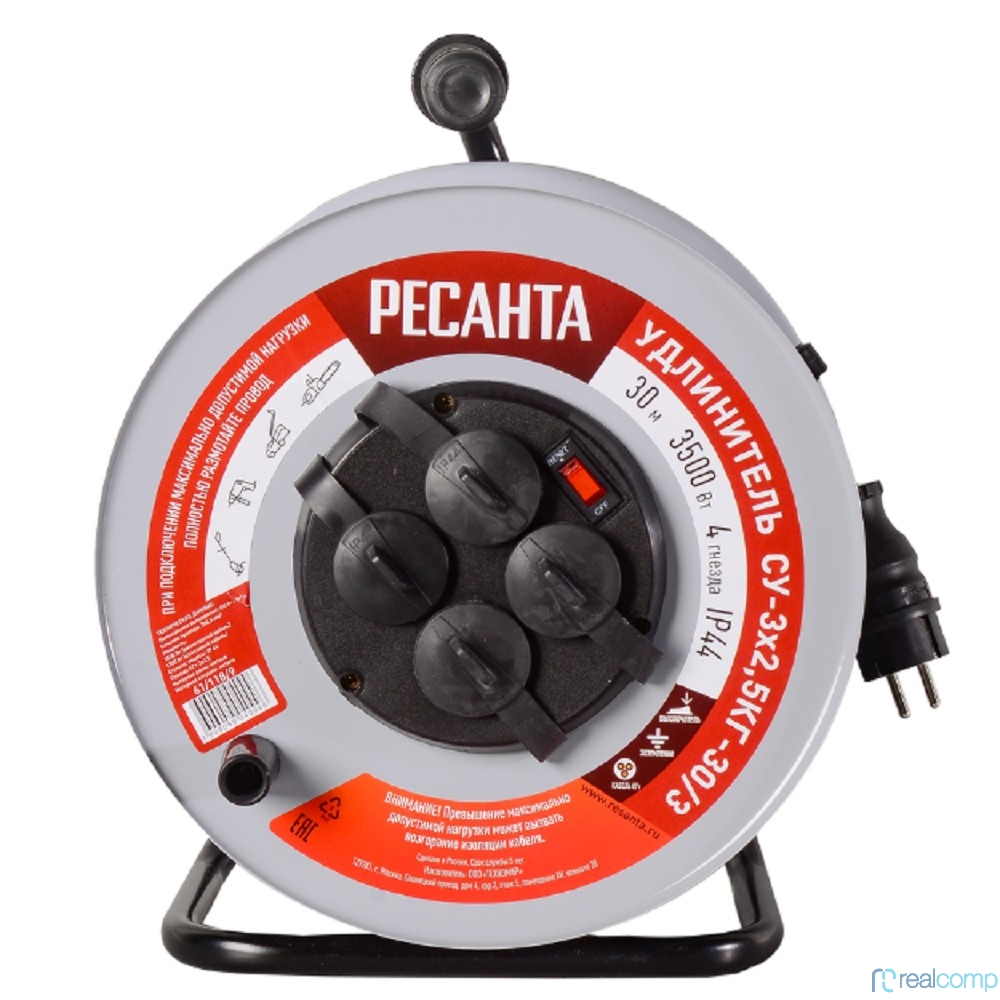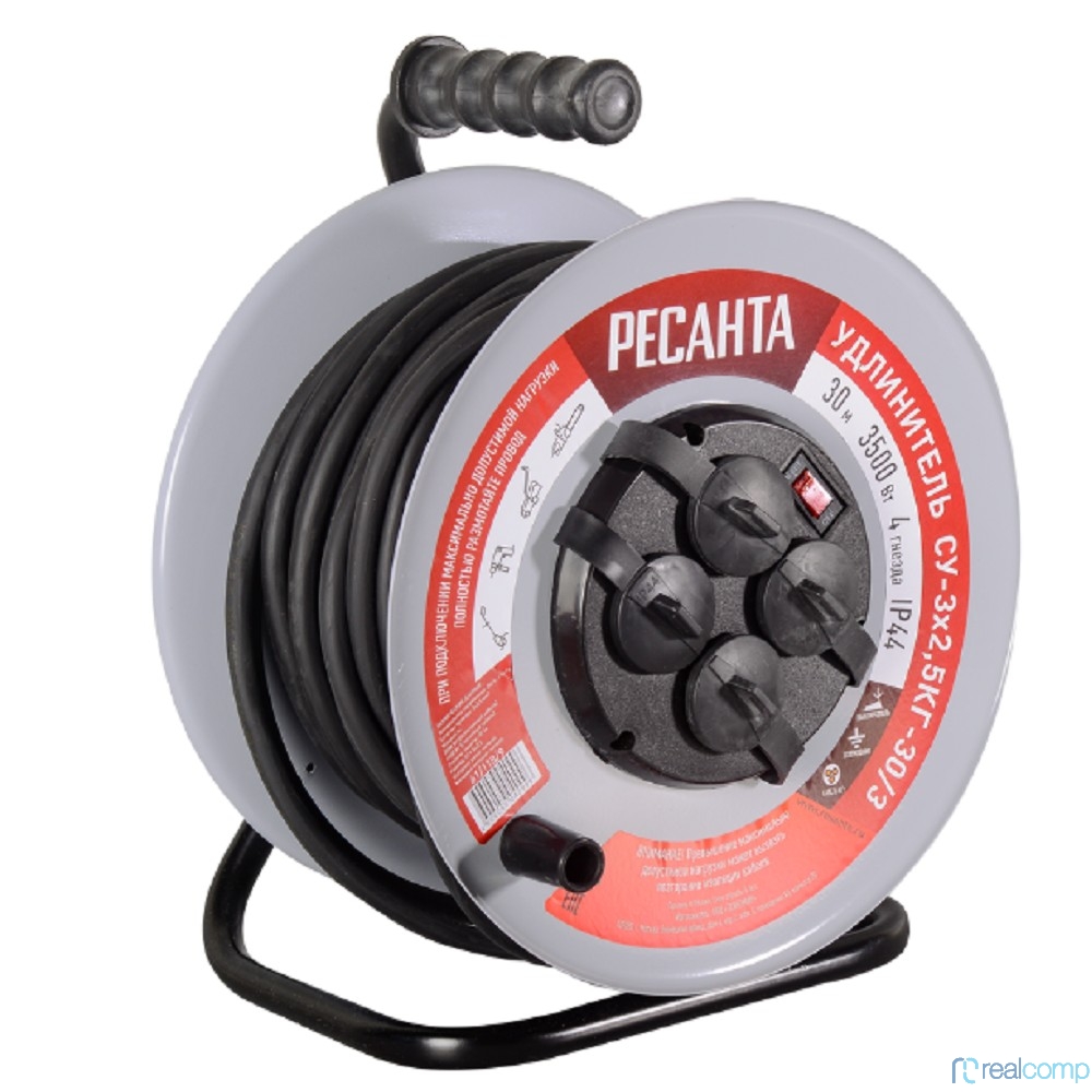 Удлинитель силовой Ресанта СУ-3х2,5КГ-30/3, розеток 4шт, 3x2.5 кв.мм, 30м, ПВС, катушка металлическая, красный [61/118/9]