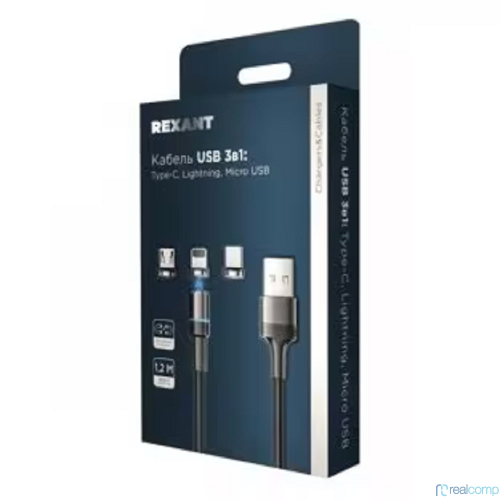 Rexant (18-7076) Кабель USB 3в1 Type-С (2A), Lightning (2,4A), Micro USB (2A), 1,2м, в черной оплетке, с LED подсветкой