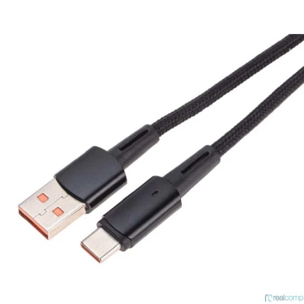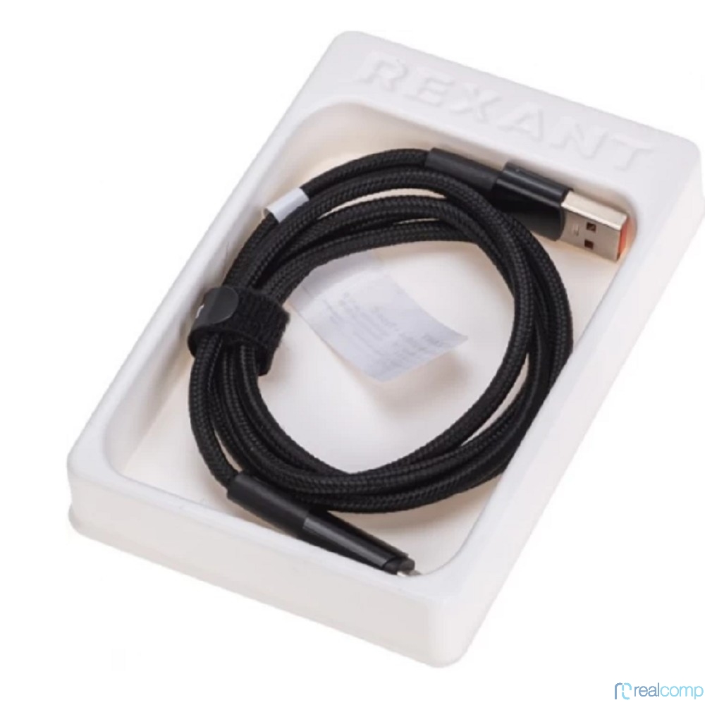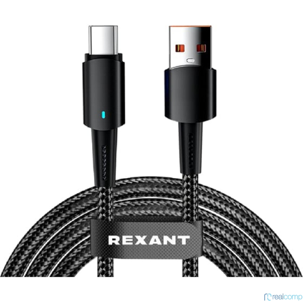 Rexant (18-7064) Кабель USB-A – Type-C, 6А, 66Вт, 1м, в черной нейлоновой оплетке, со световой индикацией