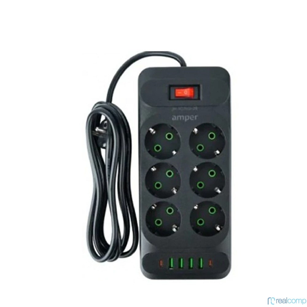 Amper сетевой удлинитель, 2,0м, 6 розеток, 10А, 2500 Вт, 4usb,2Type-C, черный. [JH-1076U-2B]