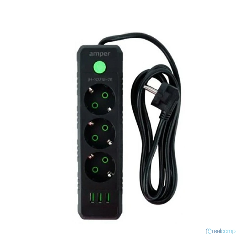 Amper сетевой удлинитель, 4,0м, 3 розетки, 10А, 2500 Вт, 3usb, черный. [JH-1031U-4B]