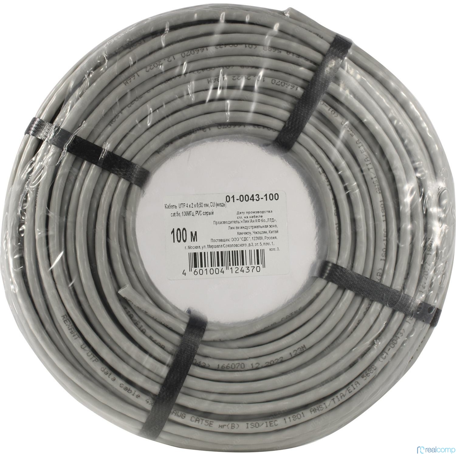 Rexant (01-0043-100) Кабель витая пара U/UTP, CAT 5e, PVC, 4PR, 24AWG, INDOOR, SOLID, серый, 100м,