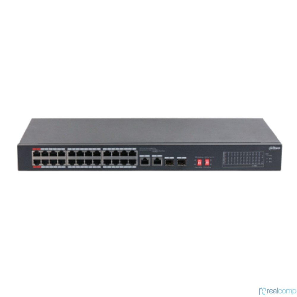DAHUA DH-S3226-24ET-240 24-портовый неуправляемый коммутатор с РоЕ, 24xRJ45 100Mb PoE, 2хКомбо SFP/RJ45 1Gb uplink, суммарно 240Вт, коммутация 8.8 Гбит/с, MAC-таблица 8К