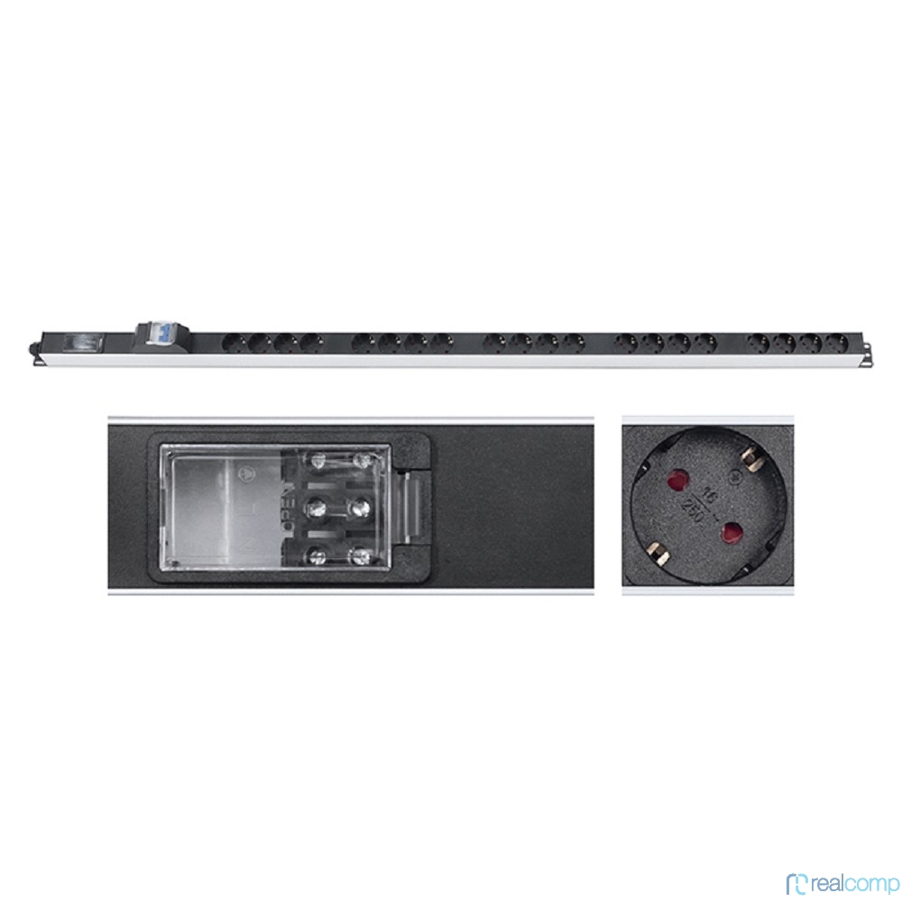 CABEUS PDU-16-20S-B-T БЛОК РОЗЕТОК ДЛЯ 19" ШКАФОВ, ВЕРТИКАЛЬНЫЙ, 20 РОЗЕТОК SCHUKO, 16А, АВТОМАТ ЗАЩИТЫ, АЛЮМИНИЕВЫЙ КОРПУС, КЛЕММНАЯ КОЛОДКА