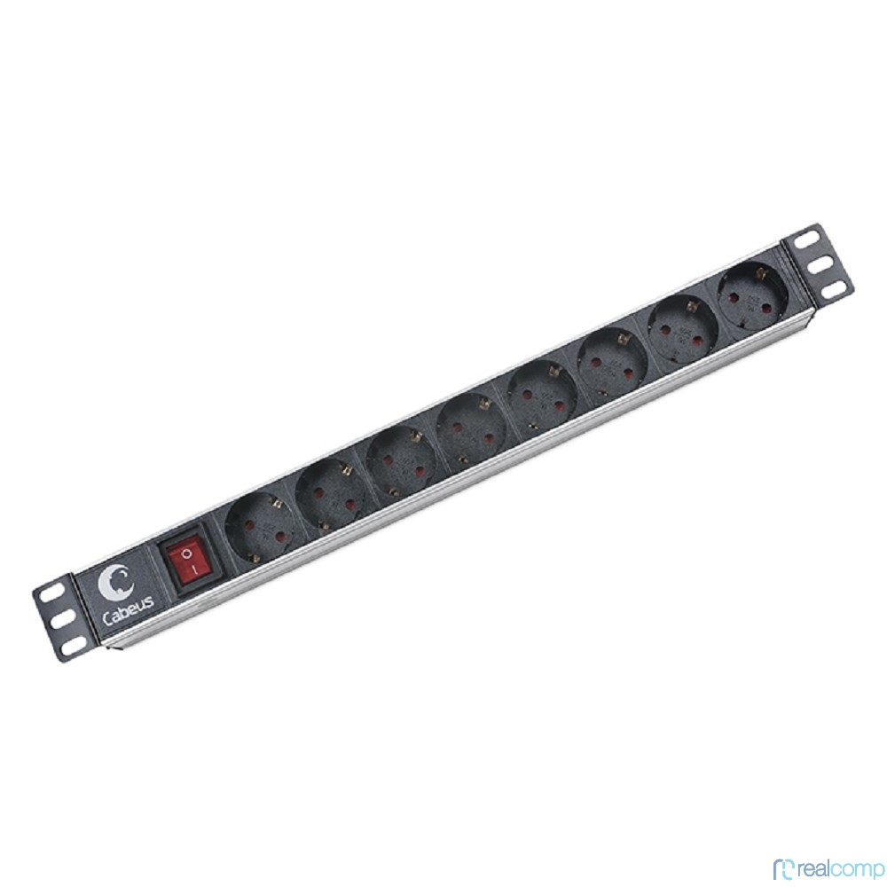 Cabeus PDU-8P Блок евророзеток для 19" шкафов, горизонтальный, 8 розеток, 10 A, выключатель, гнездо под шнур, алюминиевый корпус