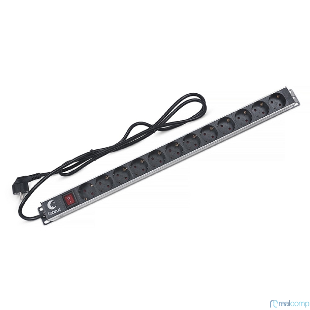 Cabeus PDU-12P-2EU Блок евророзеток для 19" шкафов, 12 розеток, 16 A, выключатель, шнур 2м, алюминиевый корпус, немецкий стандарт