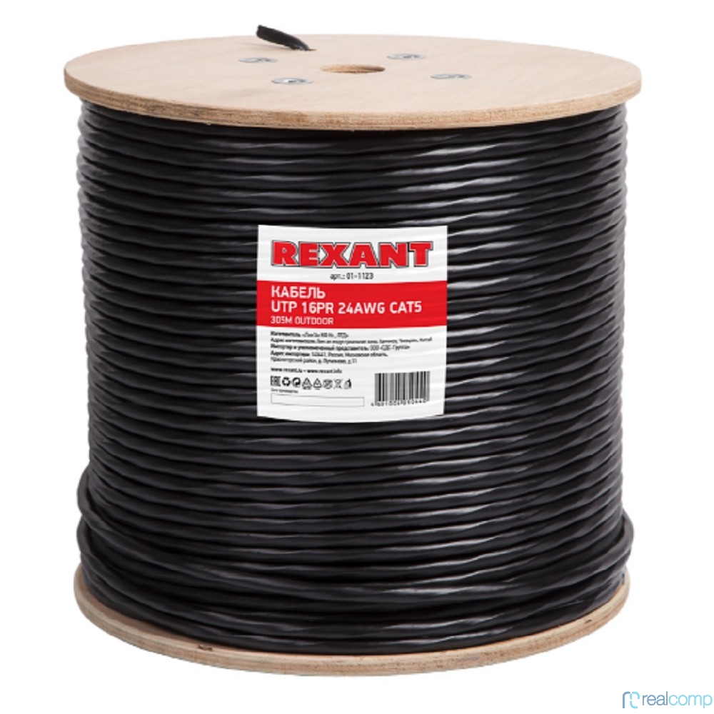 Rexant (01-1123-R) Кабель витая пара U/UTP, CAT 5е, PE, 16PR, 24AWG, OUTDOOR, SOLID, черный, 305м, РФ