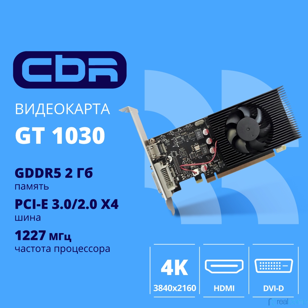 Видеокарта CBR GT1030 2Gb GDDR5, 64bit, 1228-1468Mhz, 1*HDMI + 1*DVI, 30W, Ret [VGA-STX1030-2G-RTL]