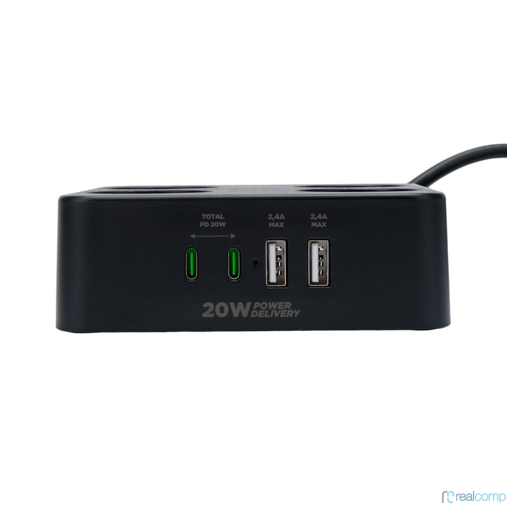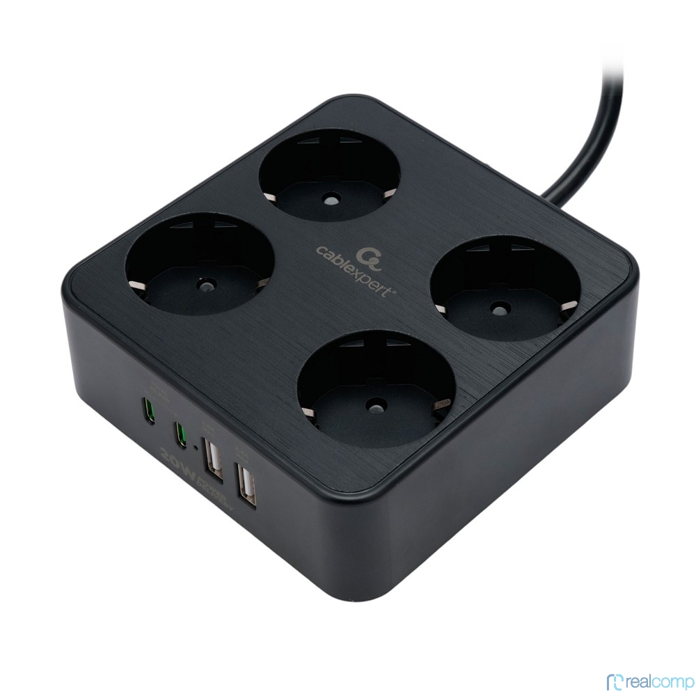 Cablexpert Сетевой фильтр Plate PLT-4-C2U2-B-3 (4р, 10А, 2xType-C PD, 20Вт, 2xUSB, 3м, ур.защиты 4+) черный, коробка {22563}