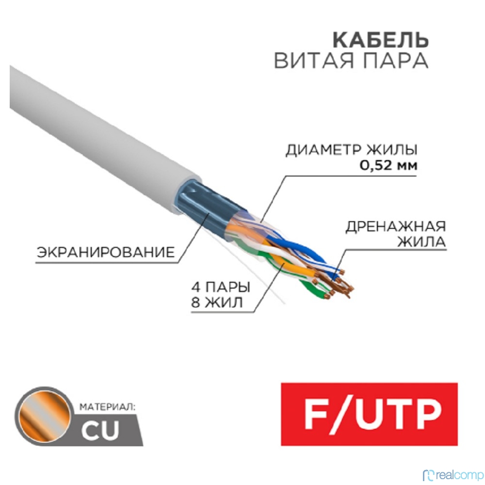 Rexant (01-0141-R) Кабель F/UTP, CAT 5e, PVC нг(А)-LS, 4x2x0,52 мм, 24AWG, внутренний, серый, 305м, РФ REXANT