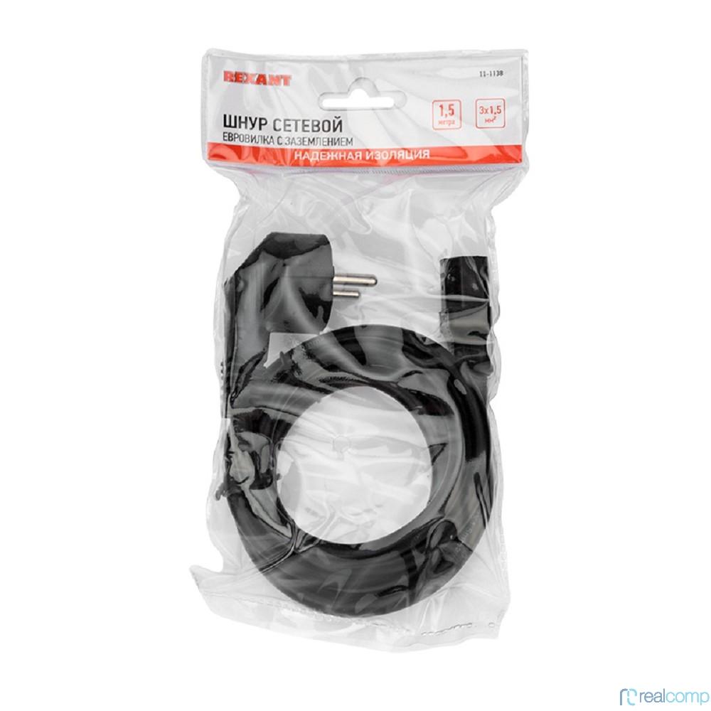 Rexant (11-1138) Шнур сетевой, вилка угловая СЕЕ 7/7(Schuko) - разъем IEC 320 C13, кабель 3x1,5 мм?, длина 1,5 метра, черный (PVC пакет)