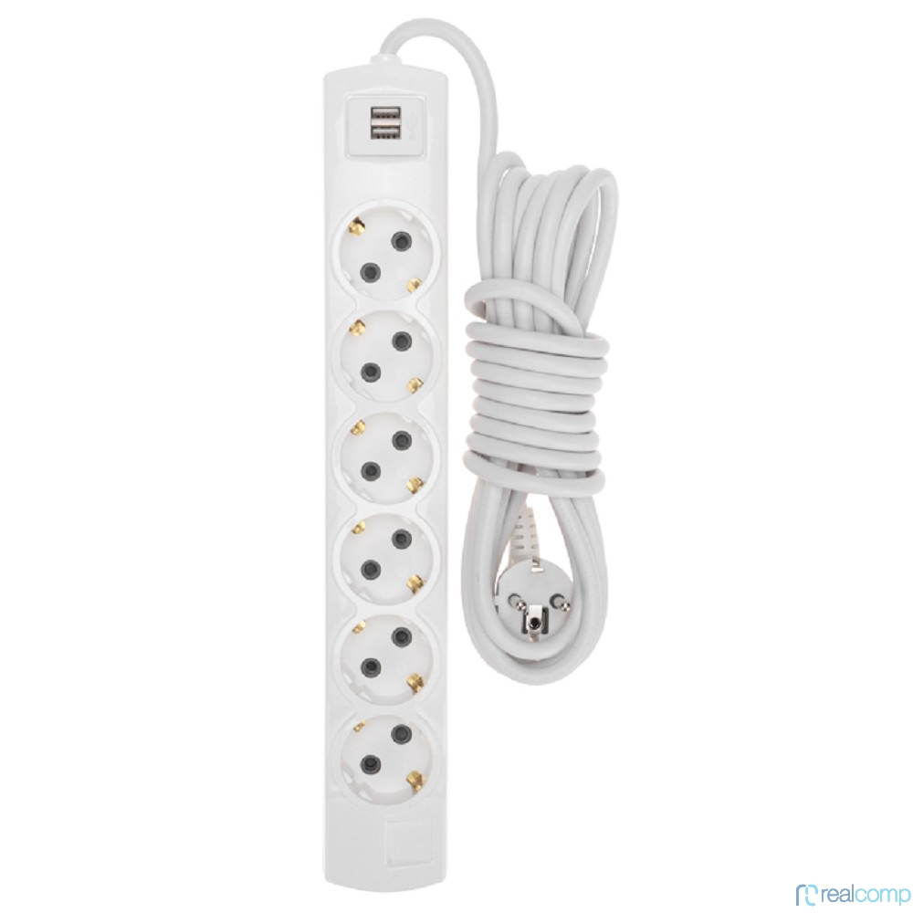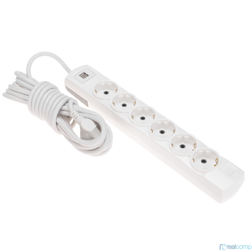 Rexant (13-4123) Удлинитель PREMIUM 6 гнезд, 5м, 3х1,5мм?, с/з, 2 USB, белый