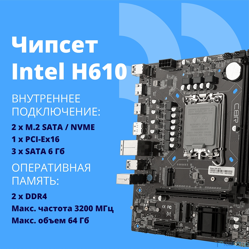 CBR H610 OEM { Chipset H610, Socket 1700, 2*DDR4, mATX, DP+2*HDMI, 1*PCIEx16,1*PCIEx1,2*M.2(NVME,SATA), 3*SATA3, 4*USB 2.0 + 2*USB3.0, LAN 1Gb} OEM УПАКОВКА