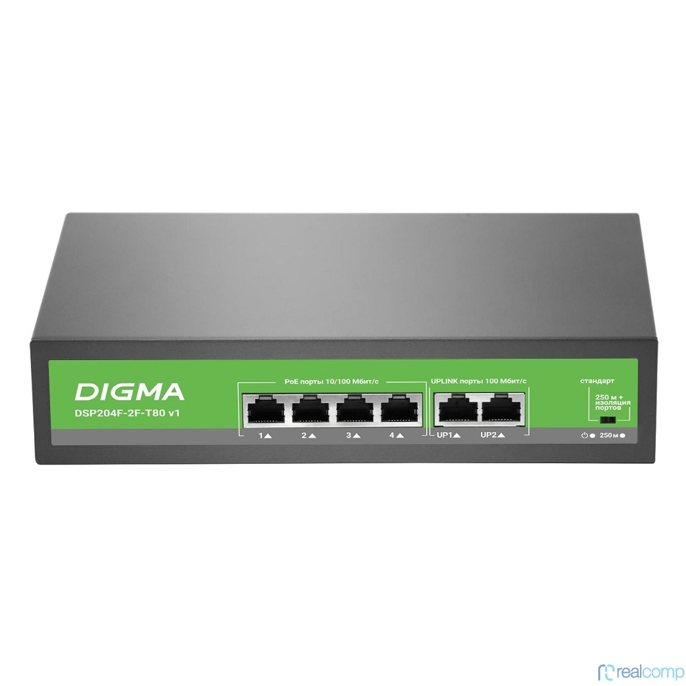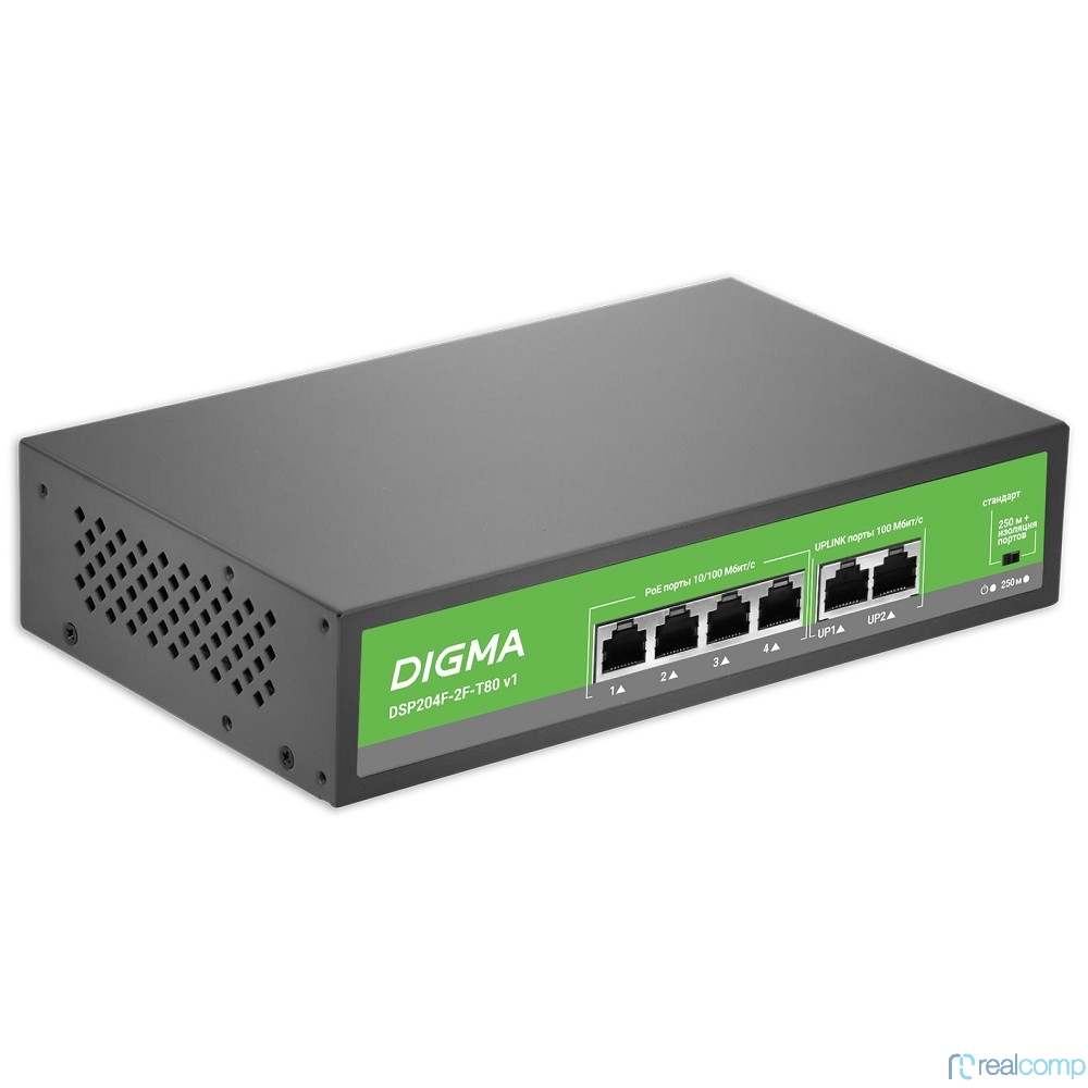 Digma DSP204F-2F-T80 Коммутатор DSP204F-2F-T80 V1 (L2) 6х100Мбит/с 4PoE 4PoE+ 80W неуправляемый