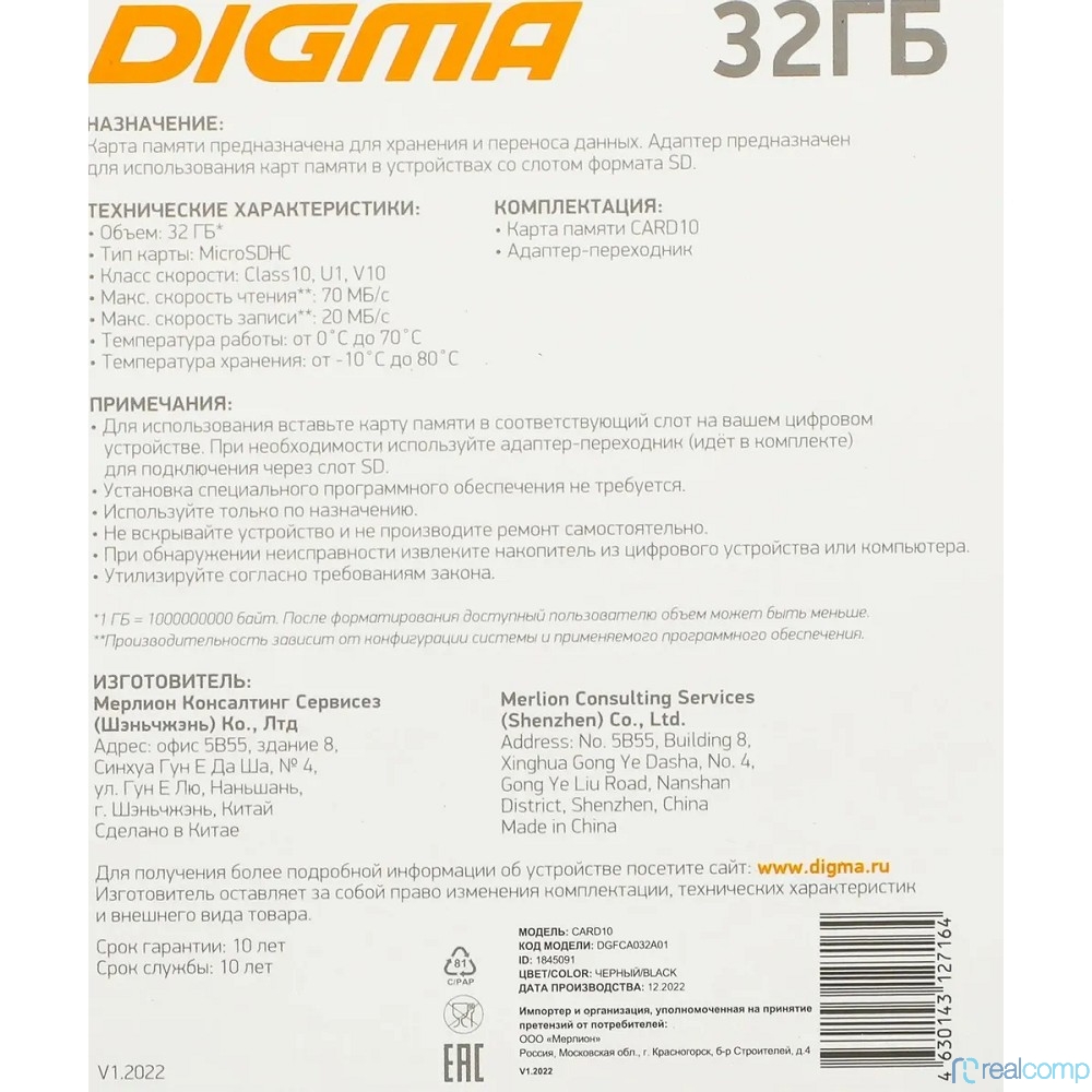 Micro SecureDigital 32GB Digma CARD10 V10 + adapter (DGFCA032A01)(1845091)