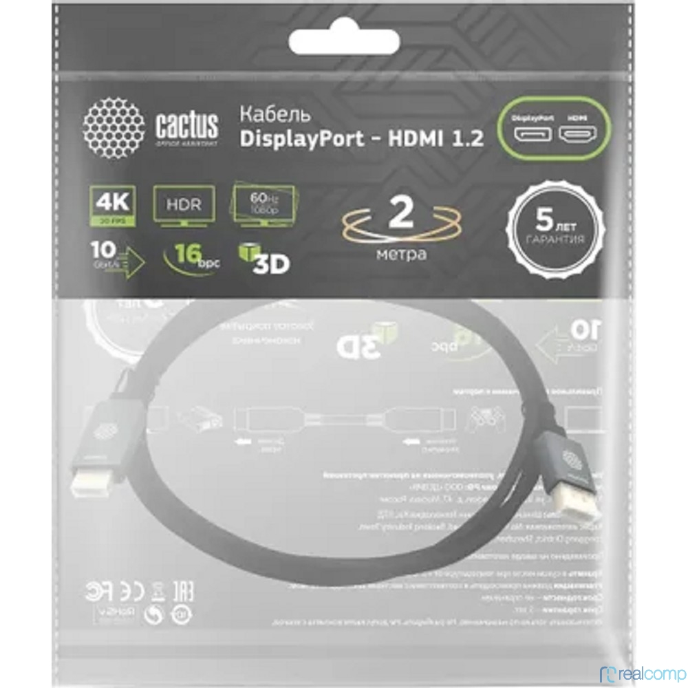 Кабель аудио-видео Cactus CS-DP-HDMI-1.2-2 DisplayPort (m)/HDMI (m) 2м. позолоч.конт. черный