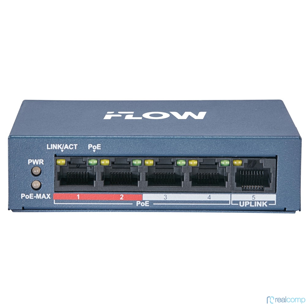 iFLOW F-SW-EU205POE-V/L L2, неуправляемый, 4 порта, 1 uplink порт 10/100M RJ45, 802.3af/at, бюджет PoE 35 Вт, поддержка режима передачи до 300м,10Мб/с, CAT6; защита от перенапряжения 6 кВ
