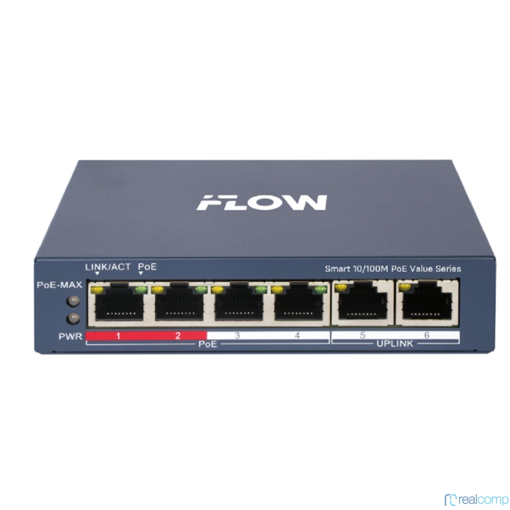iFLOW F-SW-EM206POE-VM/L L2, Смарт-управляемый, 4 порта, 2 uplink порта 10/100M RJ45, 802.3af/at, бюджет PoE 45 Вт,CAT6; защита от перенапряжения 6 кВ; настольный/настенный монтаж