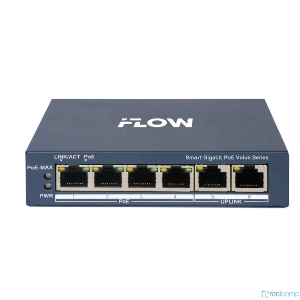 iFLOW F-SW-EM606POE-VM/L L2, Смарт-управляемый, 4 гигабитных порта RJ45 PoE, 2 uplink порта, поддержка режима передачи до 300м,10Мб/с, CAT6