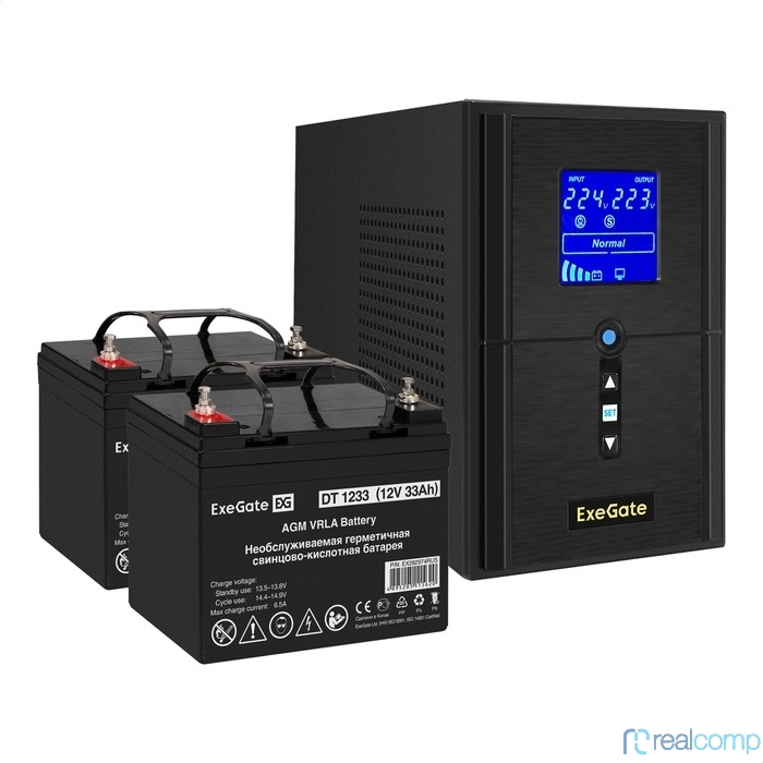 Exegate EX296791RUS Комплект ИБП EX295987RUS + батарея 33Ач EX282974RUS 2шт (инвертор, синус, для котла) SineTower SZ-1000.LCD.AVR.2SH.1C13.USB <1000VA/800W, чистый синусоида, LCD дисплей, AVR, 2*Schu