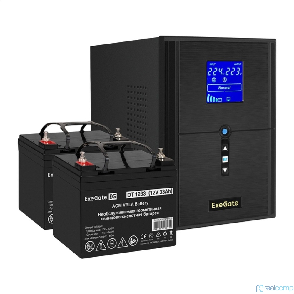 Exegate EX296837RUS Комплект ИБП EX295989RUS + батарея 33Ач EX282974RUS 2шт (инвертор, синус, для котла) SineTower SZ-2000.LCD.AVR.3SH.1C13.USB <2000VA/1600W, чистый синусоида, LCD дисплей, AVR, 3*Sch
