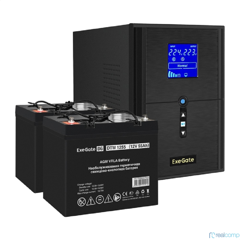 Exegate EX296842RUS Комплект ИБП EX295989RUS + батарея 55Ач EX285667RUS 2шт (инвертор, синус, для котла) SineTower SZ-2000.LCD.AVR.3SH.1C13.USB <2000VA/1600W, чистый синусоида, LCD дисплей, AVR, 3*Sch