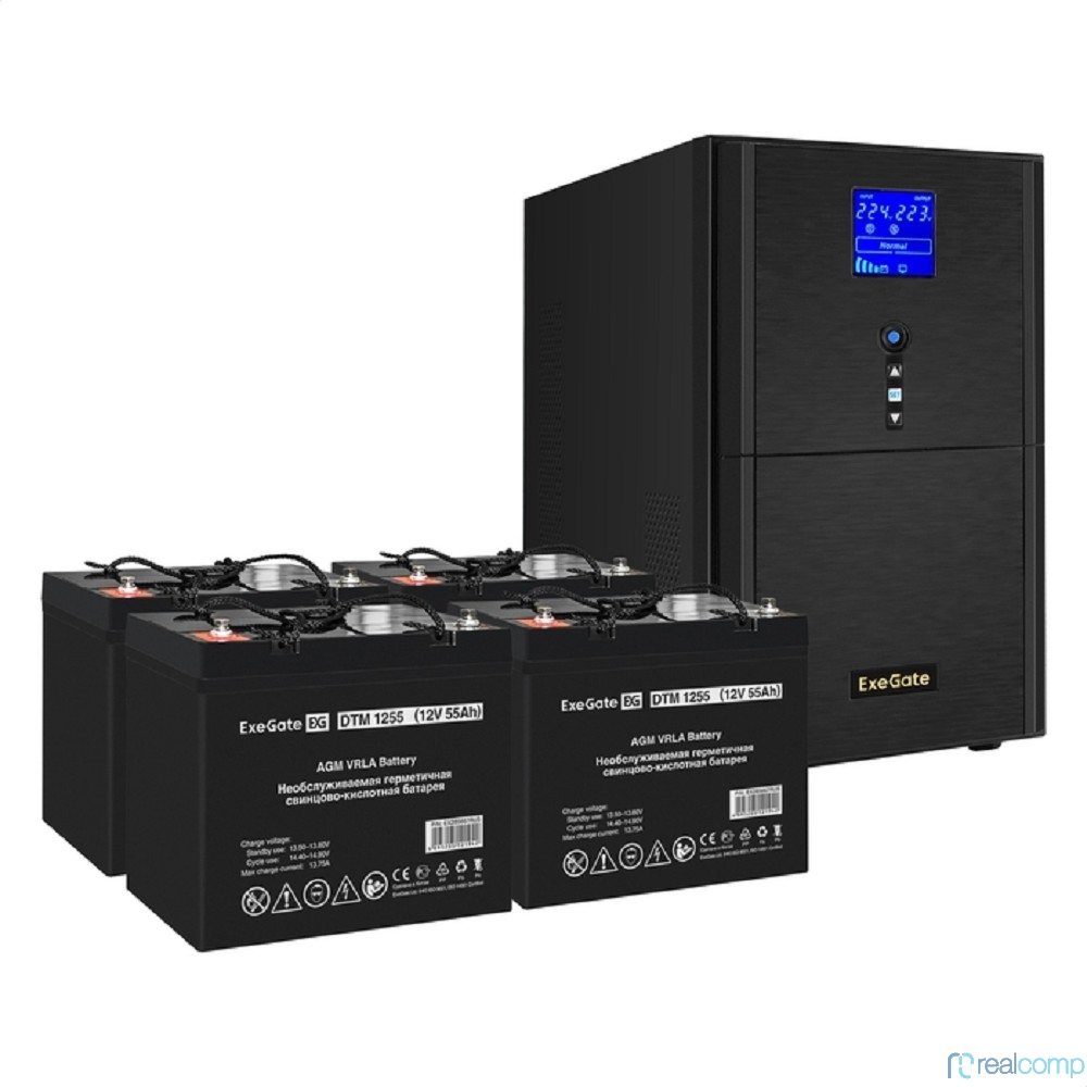 Exegate EX296888RUS Комплект ИБП EX295991RUS + батарея 55Ач EX285667RUS 4шт (инвертор, синус, для котла) SineTower SZ-5000.LCD.AVR.2SH.1C13.T.RJ.USB <5000VA/4000W, чистый синусоида, LCD дисплей, AVR,