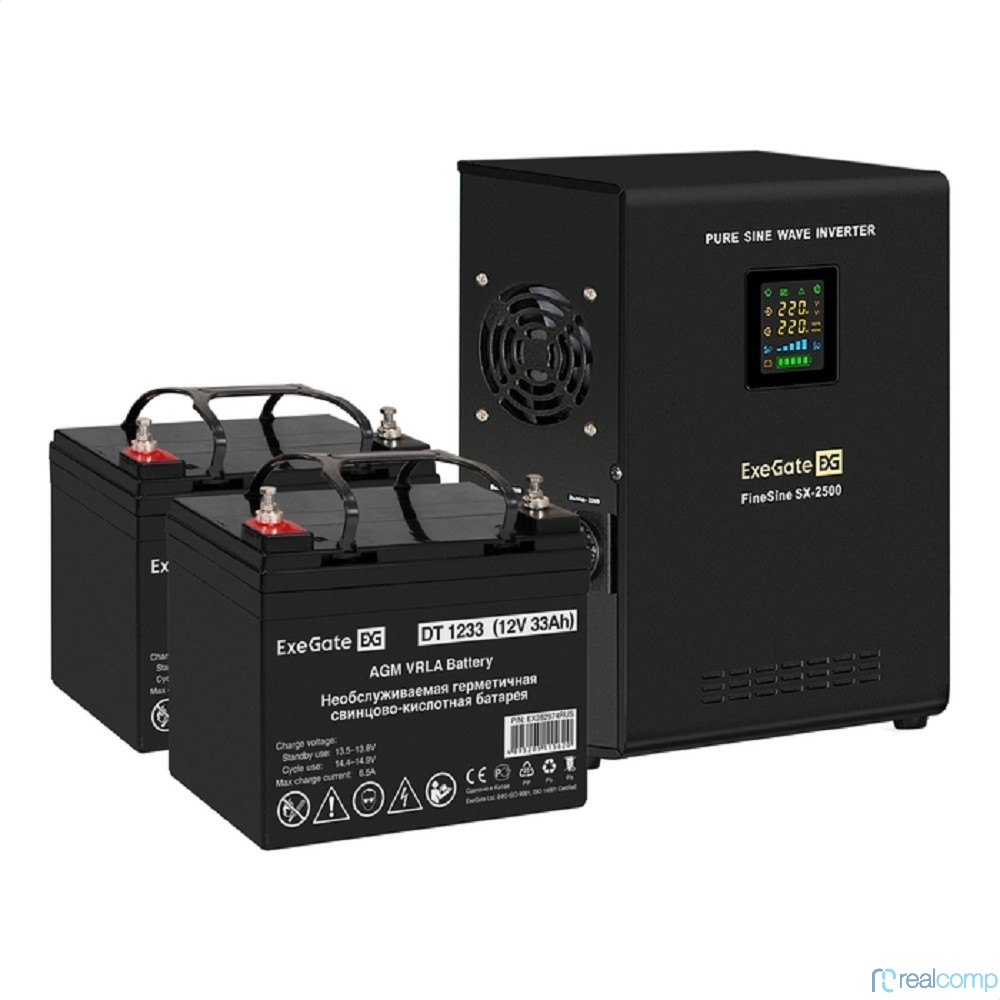 Exegate EX296610RUS Комплект ИБП EX296002RUS + батарея 33Ач EX282974RUS 2шт (инвертор, синус, для котла, настенный) FineSine SX-2500.LCD.AVR.2SH <2500VA/1800W, чистая синусоида, цветной LCD-дисплей, A