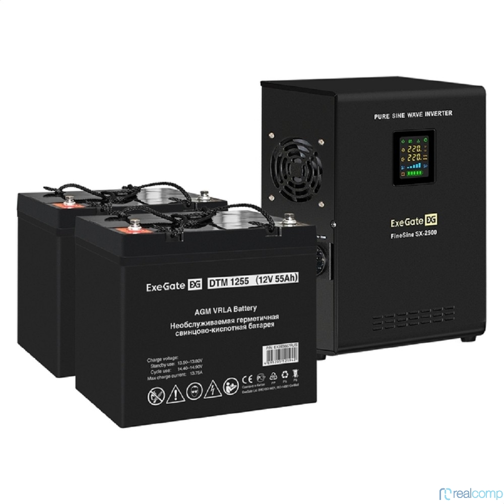 Exegate EX296615RUS Комплект ИБП EX296002RUS + батарея 55Ач EX285667RUS 2шт (инвертор, синус, для котла, настенный) FineSine SX-2500.LCD.AVR.2SH <2500VA/1800W, чистая синусоида, цветной LCD-дисплей, A