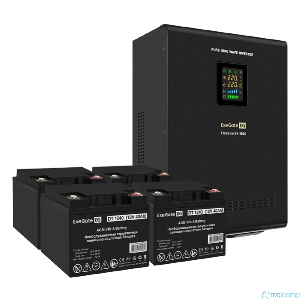Exegate EX296635RUS Комплект ИБП EX296003RUS + батарея 40Ач EX282976RUS 4шт (инвертор, синус, для котла, настенный) FineSine SX-3000.LCD.AVR.2SH.T <3000VA/2100W, чистая синусоида, цветной LCD-дисплей,