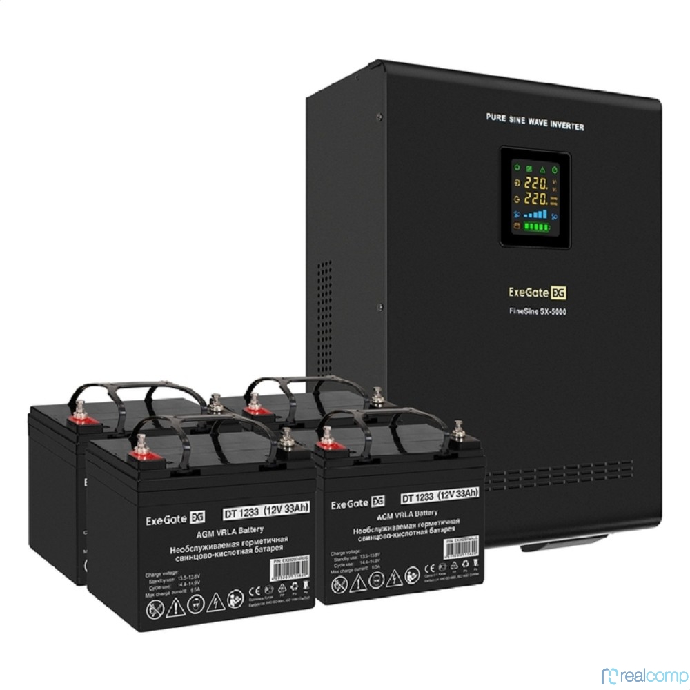 Exegate EX296656RUS Комплект ИБП EX296004RUS + батарея 33Ач EX282974RUS 4шт (инвертор, синус, для котла, настенный) FineSine SX-5000.LCD.AVR.2SH.T <5000VA/3500W, чистая синусоида, цветной LCD-дисплей,