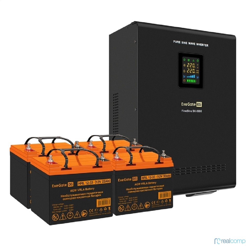 Exegate EX296657RUS Комплект ИБП EX296004RUS + батарея 33Ач EX285664RUS 4шт (инвертор, синус, для котла, настенный) FineSine SX-5000.LCD.AVR.2SH.T <5000VA/3500W, чистая синусоида, цветной LCD-дисплей,