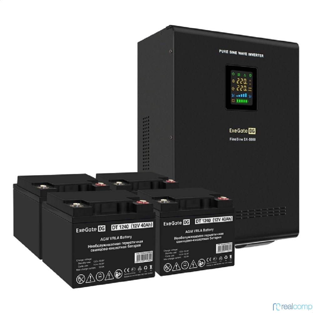 Exegate EX296658RUS Комплект ИБП EX296004RUS + батарея 40Ач EX282976RUS 4шт (инвертор, синус, для котла, настенный) FineSine SX-5000.LCD.AVR.2SH.T <5000VA/3500W, чистая синусоида, цветной LCD-дисплей,