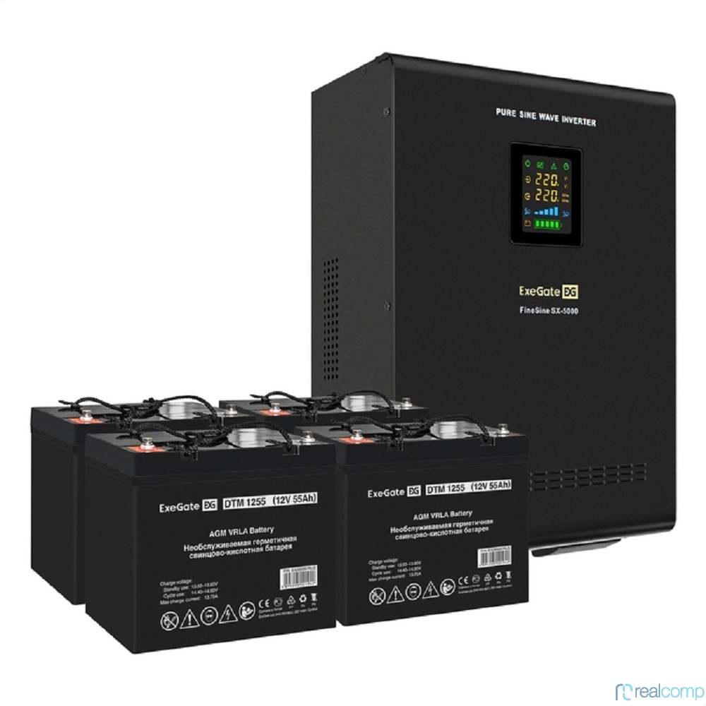 Exegate EX296661RUS Комплект ИБП EX296004RUS + батарея 55Ач EX285667RUS 4шт (инвертор, синус, для котла, настенный) FineSine SX-5000.LCD.AVR.2SH.T <5000VA/3500W, чистая синусоида, цветной LCD-дисплей,