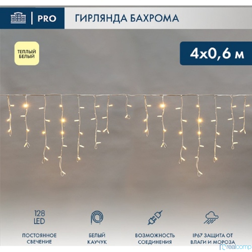 Neon-Night (255-206) Гирлянда Светодиодная Бахрома (Айсикл) 4,0Х0,6М 128 Led Теплый Белый Белый Каучук 3,3Мм Ip67 Постоянное Свечение 230В Нужен Блок 315-001