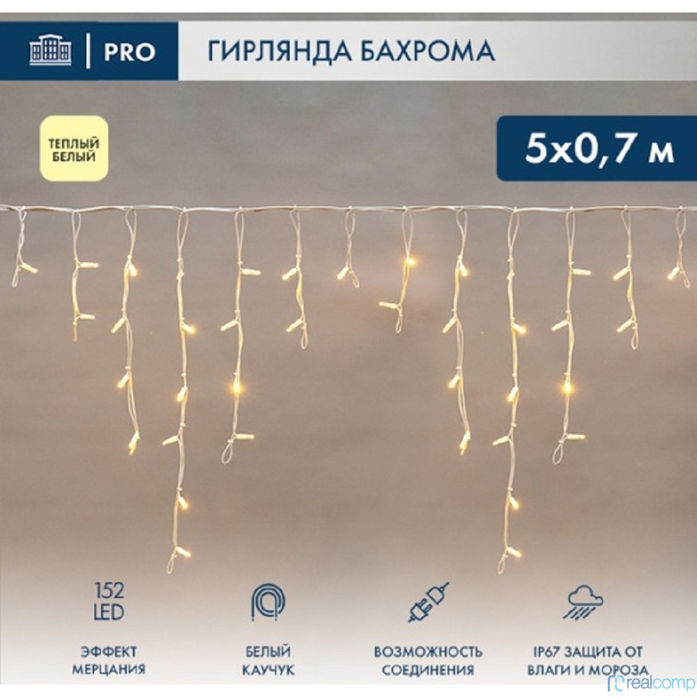 Neon-Night (255-386) Гирлянда Светодиодная Бахрома (Айсикл) 5Х0,7М 152 Led Теплый Белый Белый Каучук 2,3Мм Ip67 Эффект Мерцания 230В Нужен Блок 315-001