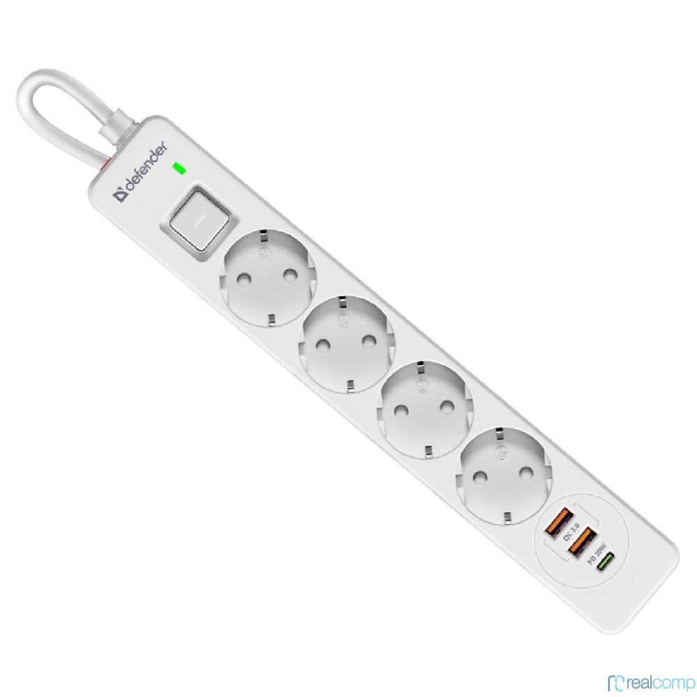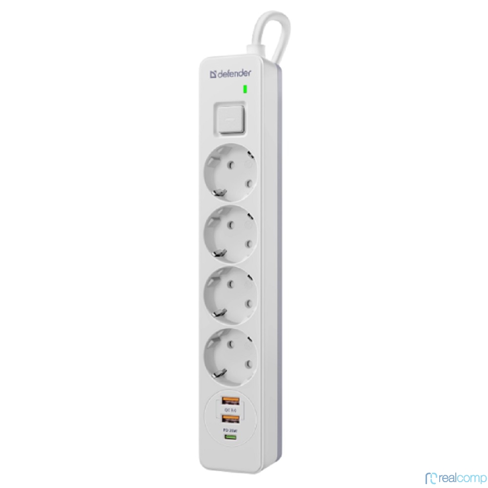 Defender Удлинитель с сетевым фильтром DFS 145 5 м,белый,4розетки,USB+TypeC [99435]