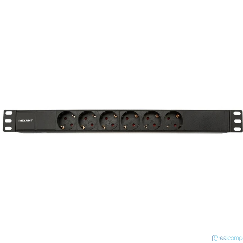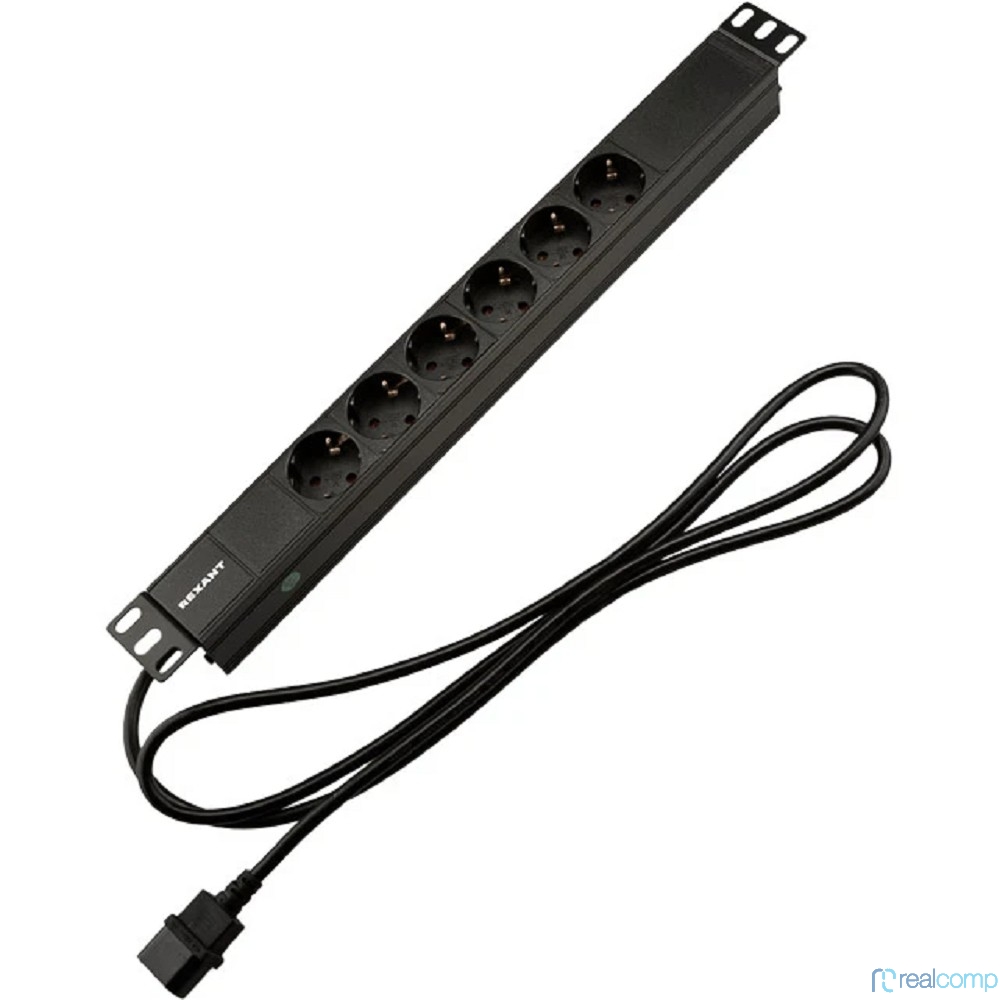 Rexant (04-0301-1) Блок распределения питания для 19" шкафов, горизонтальный, 6 розеток СЕЕ 7/4, 10A, без выкл, алюм корп, шнур 2м, вилка C14