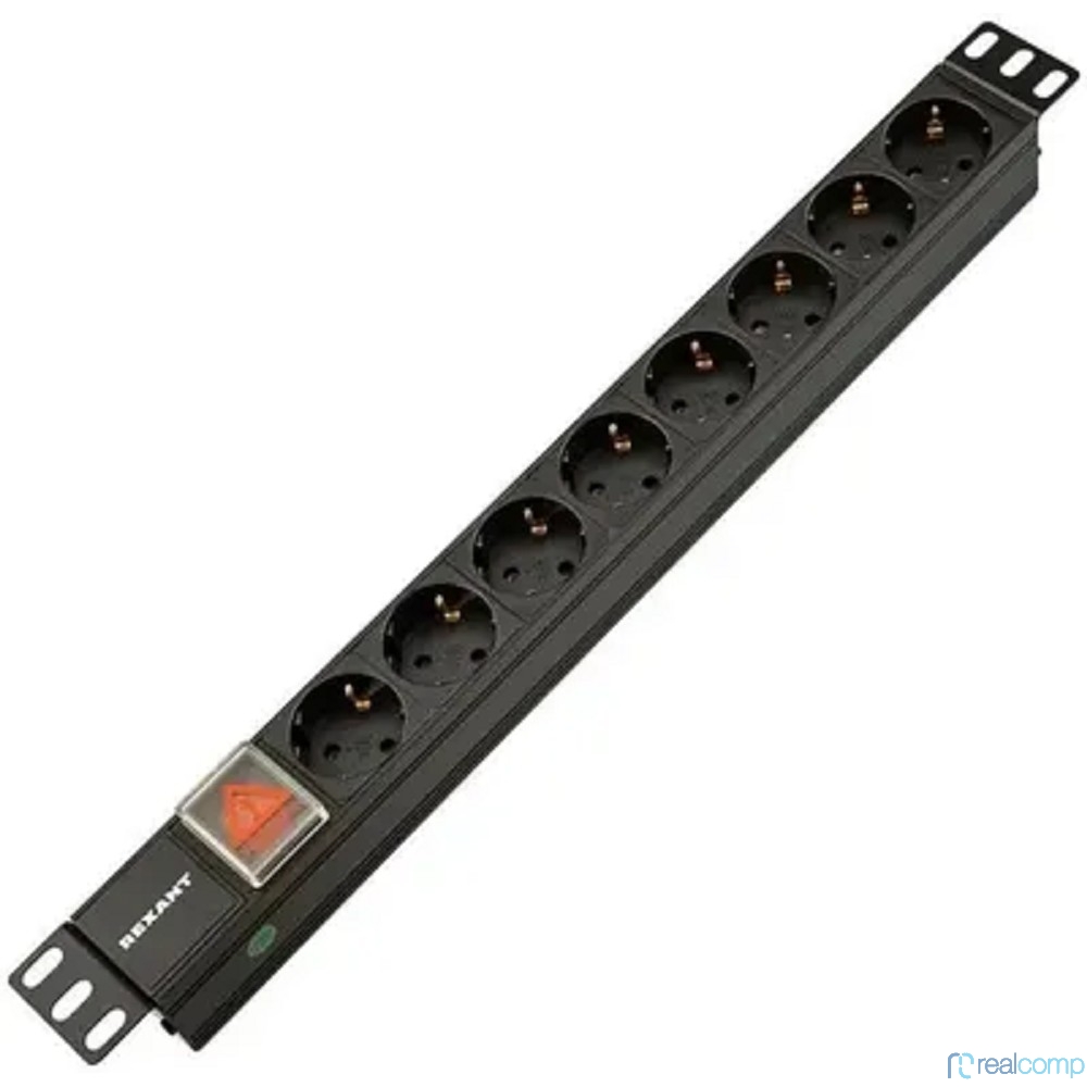 Rexant (04-0303-1) Блок распределения питания для 19" шкафов, горизонтальный, 8 розеток СЕЕ 7/4, 10A, выкл, алюм корп, гнездо C14