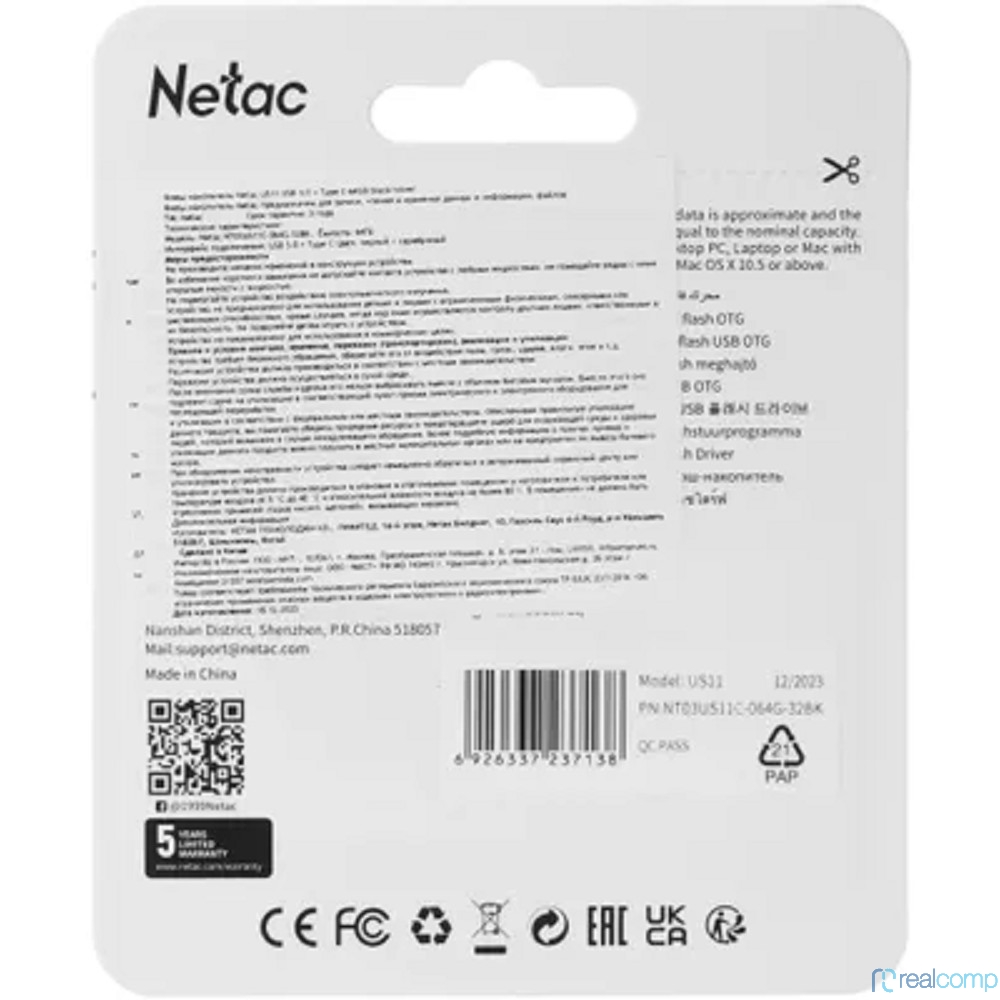 Netac USB Drive 64GB US11 USB3.2+TypeC Dual Flash Drive NT03US11C-064G-32BK