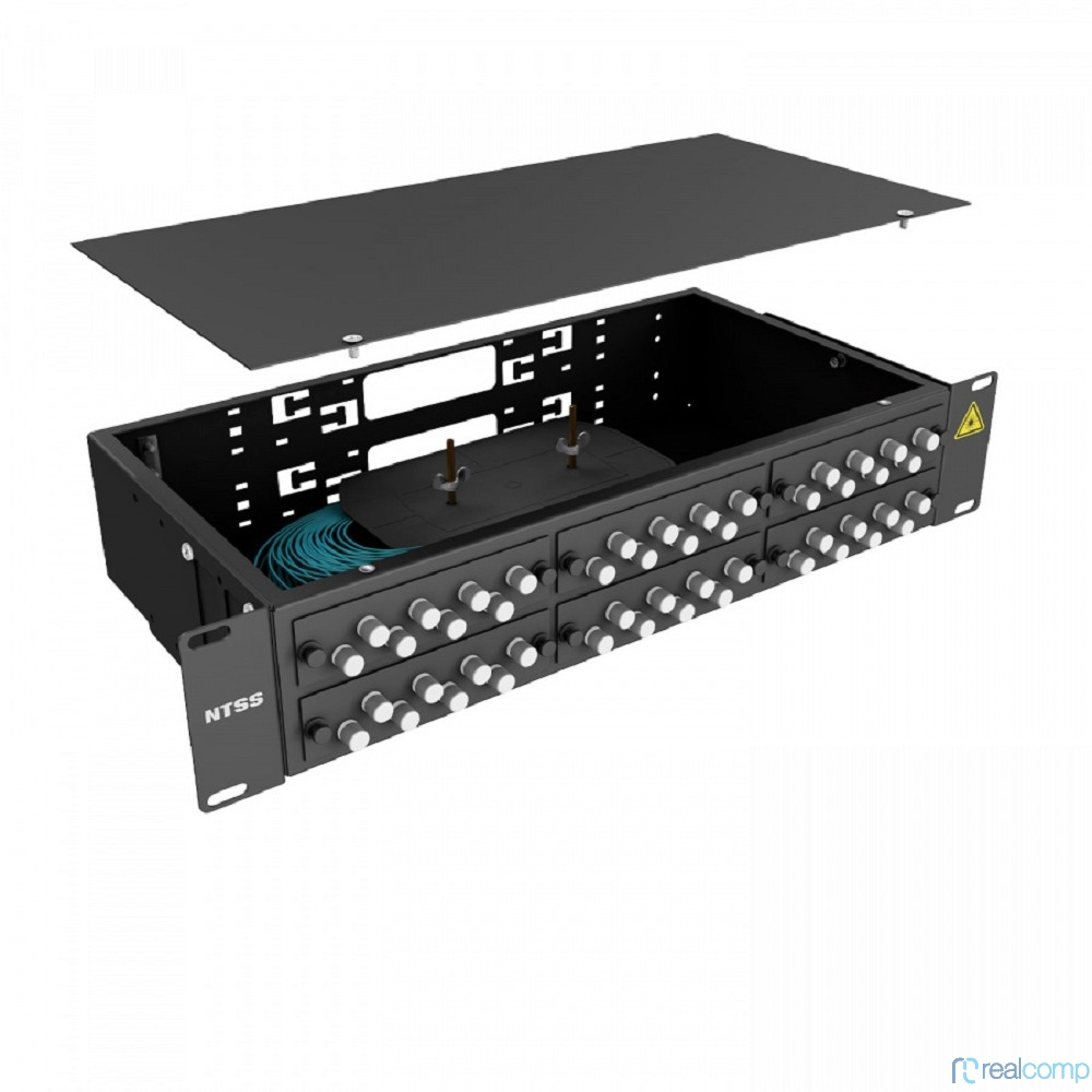NTSS Кросс 19" NTSS PREMIUM, предсобранный 2U, 48 портов FC/UPC, 50/125 мкм ОМ3, (розетки, сплайс 2шт, КДЗС, пигтейлы), черный, RAL9005 NTSS-RFOB-PM-2U-48-FC/U-503-SP1.5G2A-BL