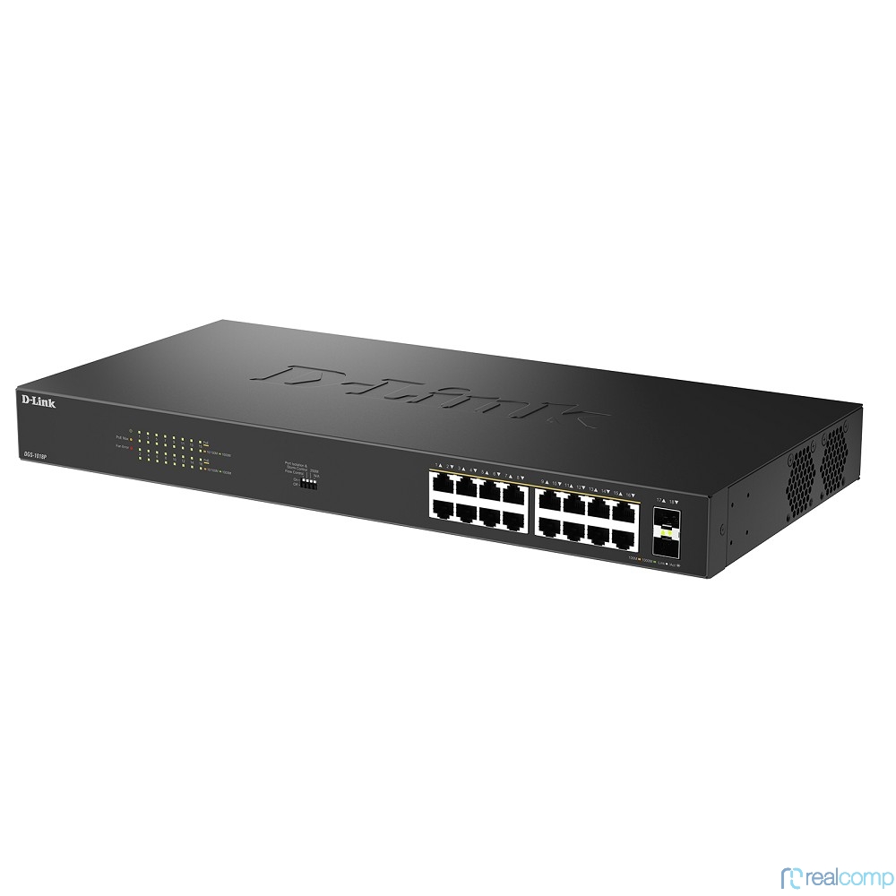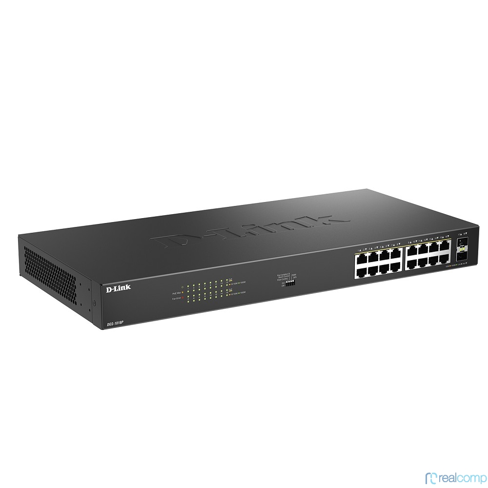 D-Link DGS-1018P/B1A Конфигурируемый коммутатор с 16 портами 10/100/1000Base-T, 2 портами 1000Base-X SFP и DIP-переключателем (16 портов PoE 802.3af/at, PoE-бюджет 240 Вт)