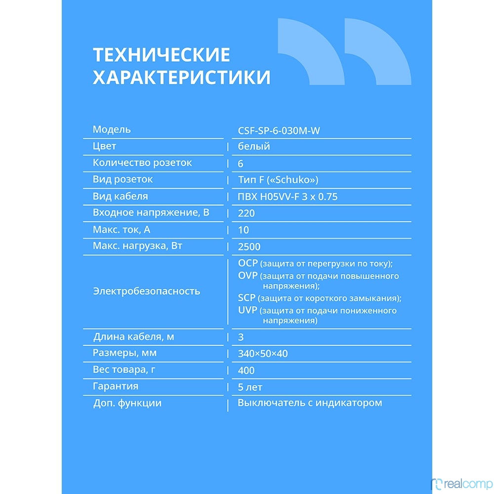 CBR Сетевой фильтр CSF SP-6-030M-W, 10A, 6 евророзеток, защита от детей, 3x0.75мм2, медь, 3 м, белый
